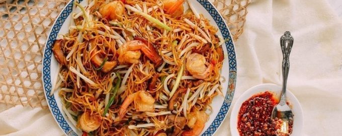 Лапша с креветками и овощами — это интересное блюдо в сингапурском стиле. Оно подается с порезанным красным перцем чили и зеленым луком.