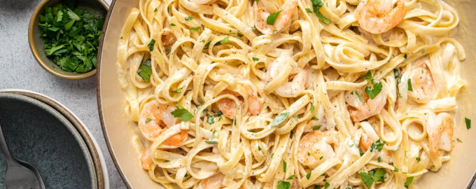 Немногие блюда могут быть столь же изысканными, как фетучини с креветками в сливочном соусе. Феттуччине — идеальная паста для этого рецепта, поскольку