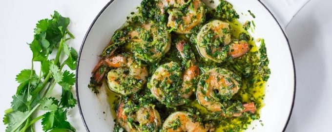 Простые обжаренные креветки с соусом чимичурри — быстрое, полезное и ароматное блюдо, который можно превратить в полноценный ужин, если подать вместе с