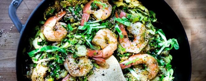 Обжаренные на сковородке креветки с брюссельской капустой и приправой фурикакэ — быстрое и полезное блюдо в японском стиле, которое можно приготовить менее