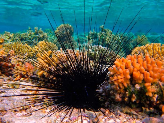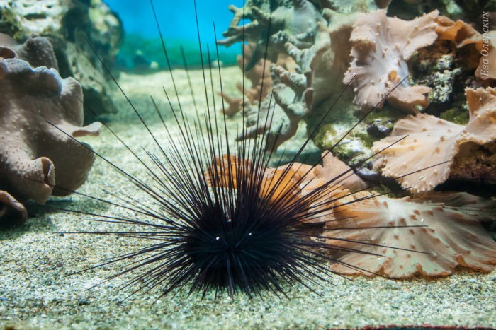 Но, самые интересные животные – это каланы (морские выдры). Поймав ежика, чтобы не уколоться и не причинить себе вред, калан долго крутит его в лапах или разбивает панцирь камнем прямо на своей груди, чтобы не потерять ни одной капли питательных веществ. При чем, каланы настолько много едят ежиков, что их кишечник, брюшина и кости покрываются в фиолетовый цвет. Это происходит из-за того, что в иглокожих содержится много пигмента.