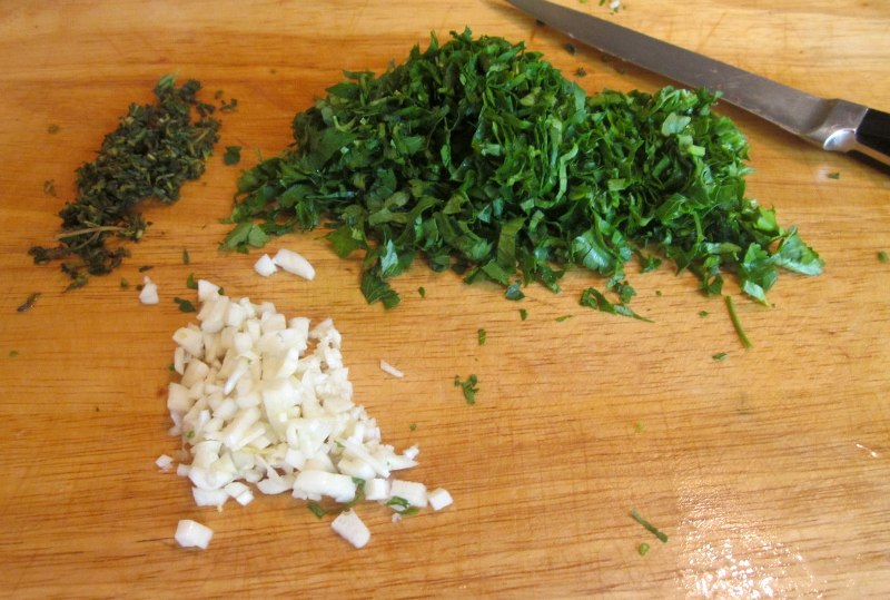Измельчить лук. Добавить к шампанскому сахар, тимьян, мяту и лук.