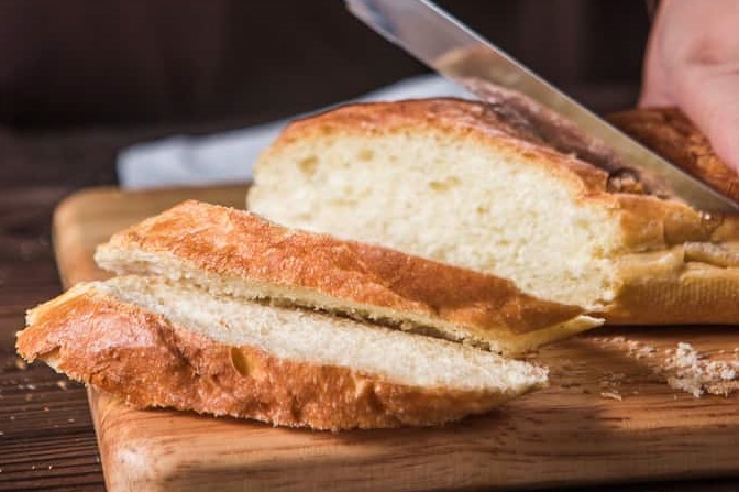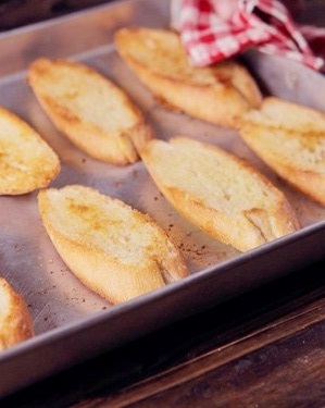 Нарежьте багет по диагонали на ломтики средней толщины (около 2-2,5 см).
