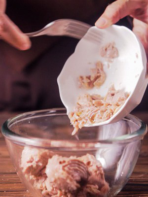 Вскройте банку с тунцом, слейте лишнюю жидкость и переложите рыбу в глубокую посуду.