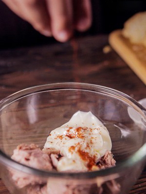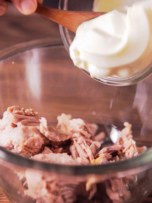 В тарелку с тунцом выложите майонез.