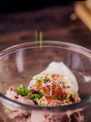 Петрушку очень мелко порубите и половину отправьте к тунцу, приправьте щепоткой соли и перца. Перемешайте.