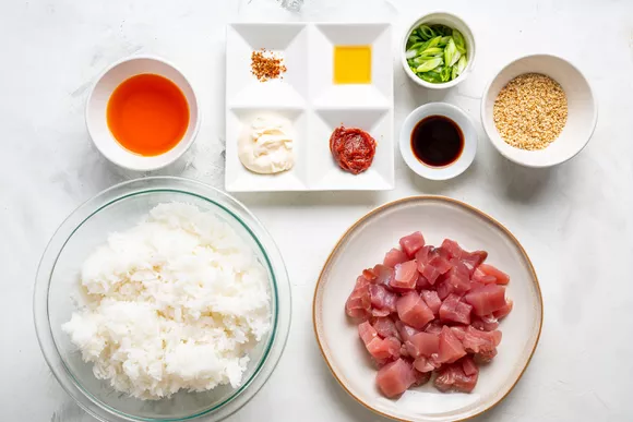 Подготовьте ингредиенты для донбури с тунцом и рисом.