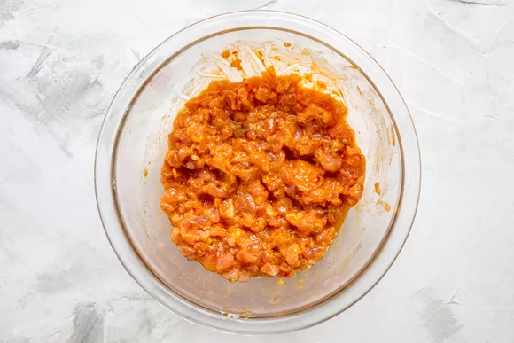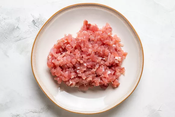 Мелко нарежьте тунец так, чтобы получился практически фарш.