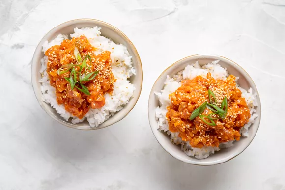 Разделите смесь на две порции и выложите ее сверху риса в мисках.