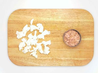 Из Моцареллы слейте сыворотку, промокните бумажным полотенцем и руками порвите (или просто нарежьте) на произвольные кусочки. С тунца также слейте жидкость.