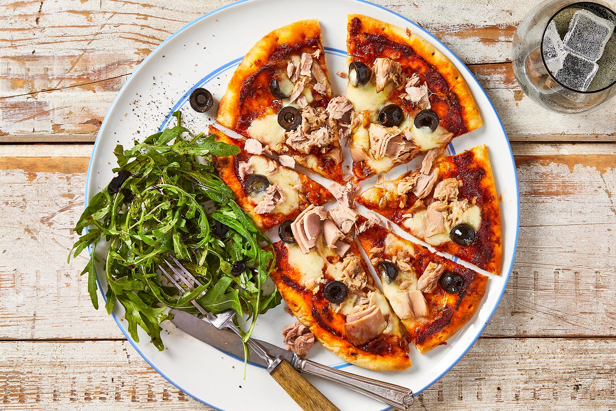 Приготовьте супер быструю пиццу, на которую у вас уйдет не более получаса. Это не привычная всем пицца с колбасой или грибами, это рецепт пиццы с консервированным тунцом и оливками.