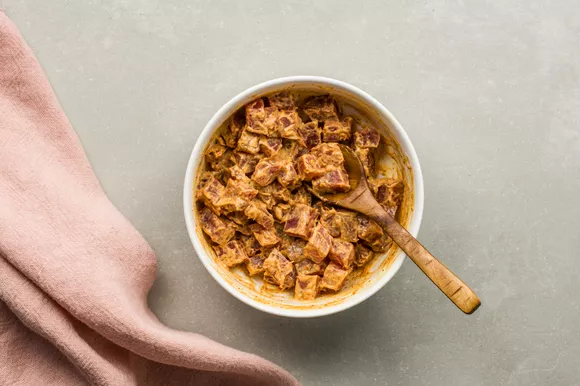 Нарежьте тунца на мелкие кубики. Смешайте в миске с майонезом и молотым перцем.
