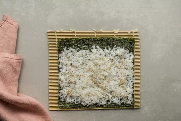 Положите лист нори на бамбуковый коврик. Сверху выложите 1/4 часть готового риса и равномерно распределите. Оставьте небольшую полоску в верхней части листа, чтобы завернуть ролл. Рис посыпьте кунжутом.
