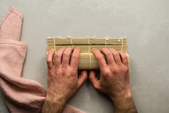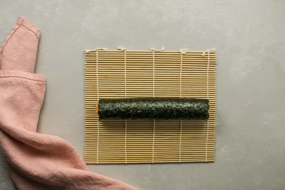 Сверните бамбуковый коврик, начиная снизу, чтобы придать роллам цилиндрическую форму.
