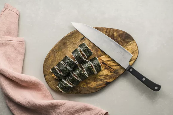 Перед нарезкой протрите нож влажной салфеткой. Нарежьте свернутый ролл на кусочки на разделочной доске.
