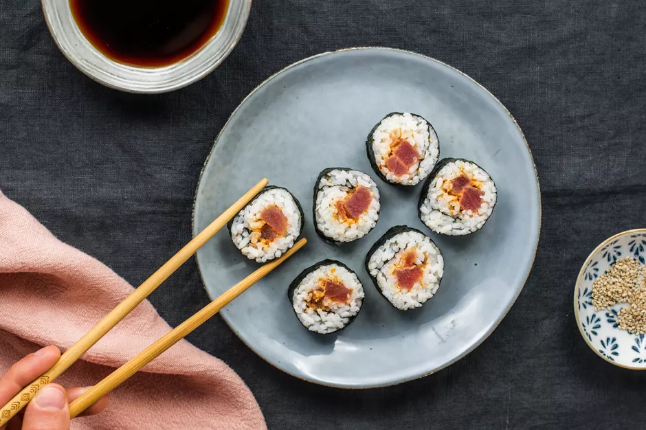 Острые роллы с тунцом — отличное блюдо для семейной трапезы или ужина с друзьями. В этом рецепте нори (сушеные морские водоросли) наполняются рисом и острым тунцом.