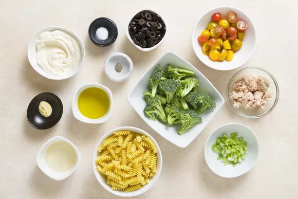 Подготовьте ингредиенты для салата с макаронами и тунцом.