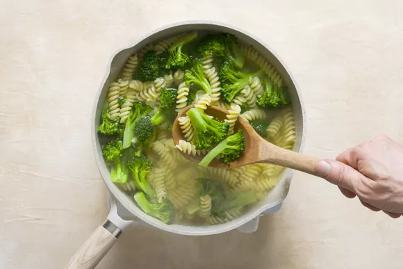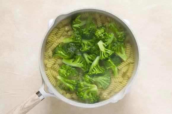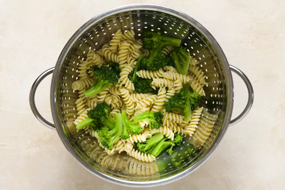 Сразу же промойте макароны и брокколи под холодной проточной водой и хорошо процедите через дуршлаг.