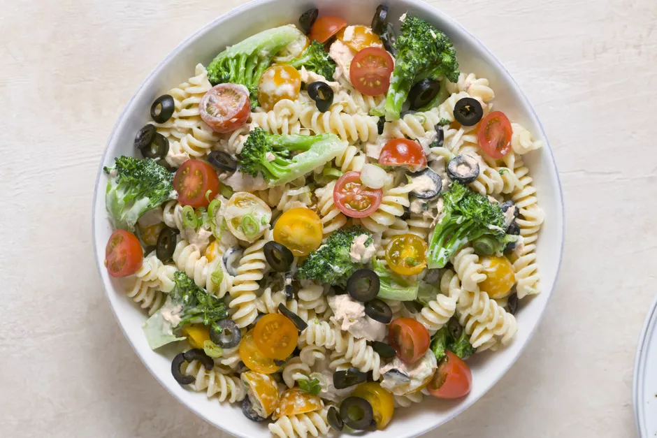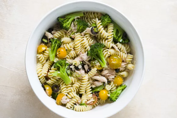 Салат с макаронами и тунцом — классика для пикников и полноценных перекусов. В представленном рецепте это блюдо становится еще вкуснее благодаря добавлению брокколи, сочных помидоров черри, оливок и лука-шалота.