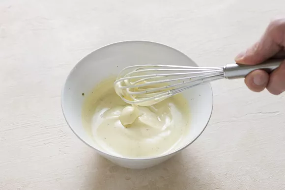 В небольшой миске смешайте майонез, оливковое масло, уксус, горчицу (если используете), соль и перец.