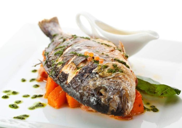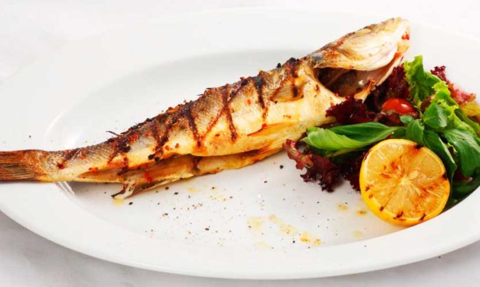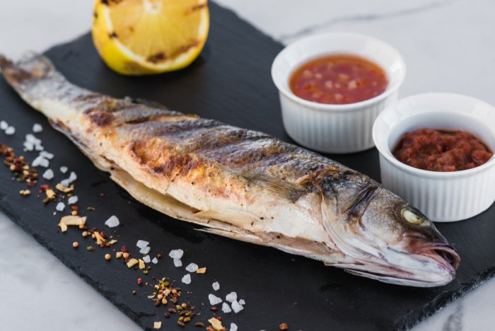 - стандартно запечь рыбу на гриле. Для морского судака достаточно двадцати пяти минут обжарки;