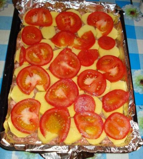 почистить и нарезать овощи: клубни картофеля (шайбами), репчатый лук (кольцами), томаты (крупными кубиками