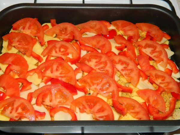 в смазанную растительным маслом форму для запекания выложить поочерёдно: картофель / лук / томаты