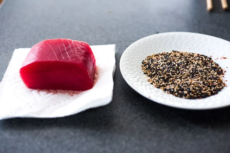 Приготовьте лапшу в соответствии с инструкцией на упаковке, слейте воду и отложите в сторону. Пока лапша варится, обсушите тунца. Смешайте ингредиенты для кунжутной обсыпки в небольшой тарелке. Добавление щепотки сахара в смесь поможет создать хорошую корочку.