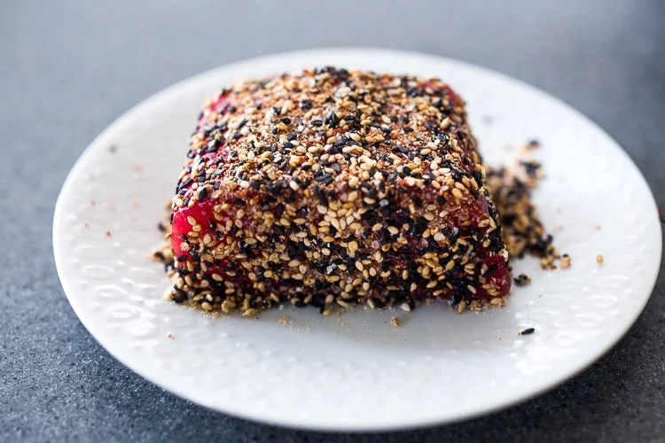 Обмажьте тунца со всех сторон, плотно вдавливая обсыпку в мякоть. Также приготовьте заправку, смешав все ингредиенты в миске, и отложите ее в сторону.
