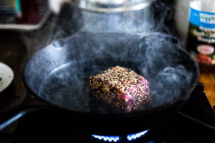 Разогрейте кокосовое масло (или другое растительное для высокотемпературной жарки) в чугунной сковородке до дыма. Сковорода должна быть очень горячей, чтобы у тунца образовалась золотистая корочка, но при этом он не прожарился до конца в середине. Обжаривайте кусок филе по 45-60 секунд с каждой стороны или до золотистой корочки.