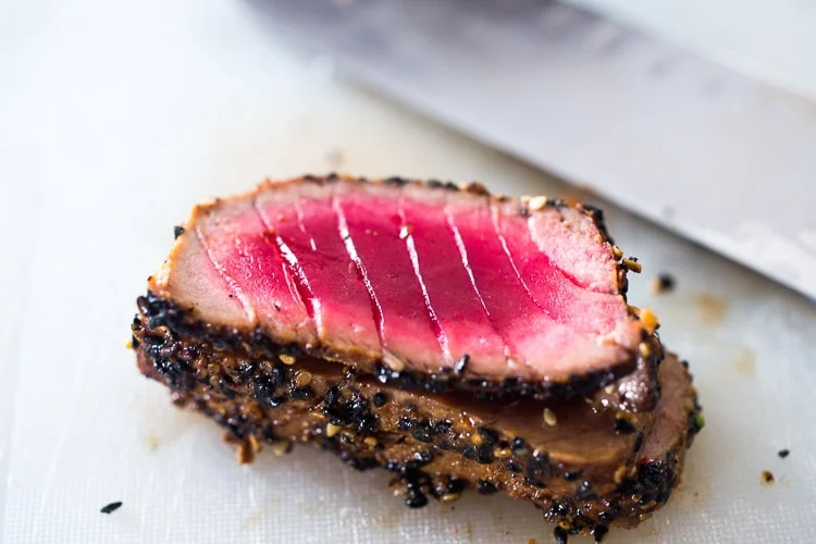 Снимите с огня и выложите тунца на бумажное полотенце. Дайте постоять 5 минут. Острым ножом нарежьте филе поперек волокон на 6-8 тонких кусочков.