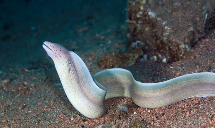 Любитель напасть из засады, ближайший родственник мурены – угорь. Он также плотно покрыт слизью и лишен чешуи. Правда менее агрессивный, и окраска более спокойная, однотонная. Камуфляжный окрас помогает во время охоты.