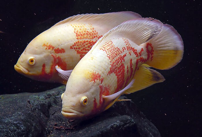 - интересный представитель семейства астронотуса – селекционный альбинос. Мощь, красота, интеллект. Голова подводного обитателя большая с выразительными глазами. 30 сантиметровая рыбка вырастает в темпераментного бычка 25-35 см. Дорогой вид