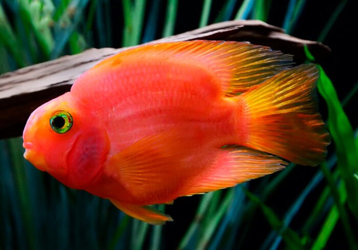 - красный попугай дитя рук человеческих. Привлекает ярко-оранжевым окрасом. Отрицательным фактором станет невозможность их разведения из-за бесплодия самцов. Не встречается в природе. Растет до 20 см;