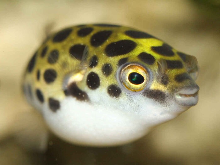 - тельце зеленого тетрадона украшено черными пятнышками. Выделяются большие глаза. Характерная черта – отсутствие чешуи. Сильные челюсти и пластины на месте зубов для измельчения добычи. Крайне агрессивная рыбка. Максимальный размер 15-17 см;