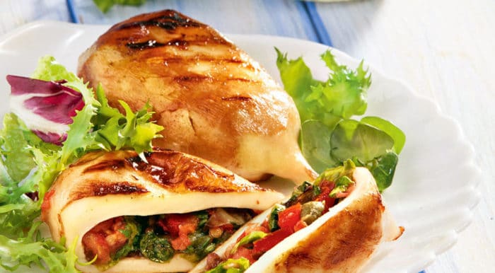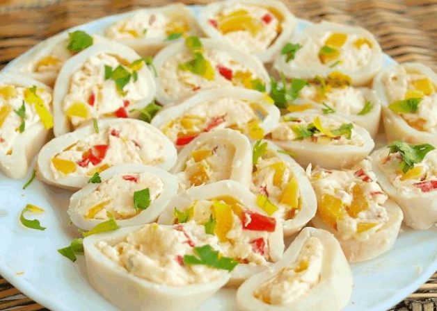 Фаршированные кальмары подают в охлажденном виде в качестве закуски. Ниже приведены простые низкокалорийные рецепты, которые популярны в диетическом питании.