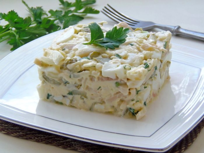 - Соединяем все продукты и заправляем майонезом. При желании его можно заменить сметаной. Затем солим и перчим. Украшаем нарезанной петрушкой и укропом.