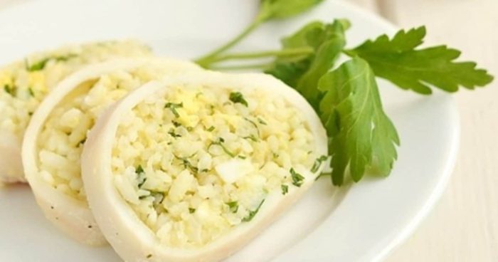 Кальмары, фаршированные яйцом, луком, рисом