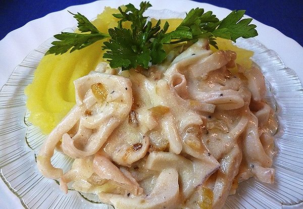 Тушеные кольца кальмара в сметанном соусе