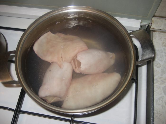 После варки очистите тушки кальмаров от пленок, других внутренностей. Затем дайте полностью остыть.