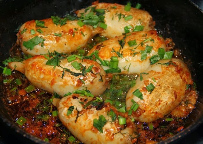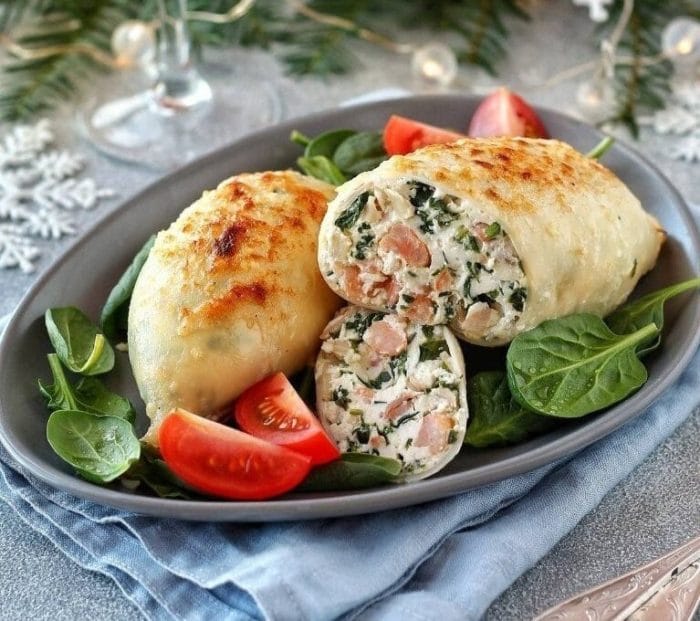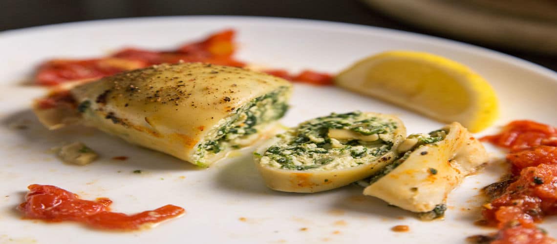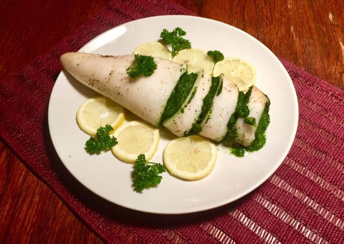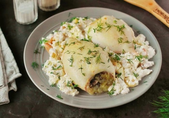 В этом варианте начинка для кальмаров готовится с использованием шпината. Низкокалорийное блюдо идеально подойдет для тех, кто следит за своим весом.