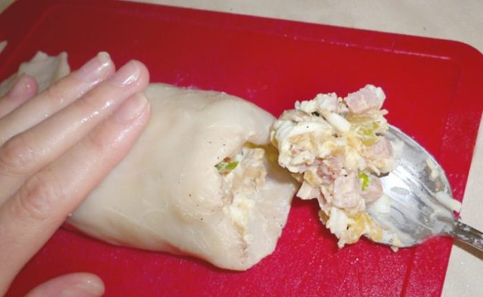 - После того, как масса остыла, плотно выкладываем рыбную начинку в тушки.