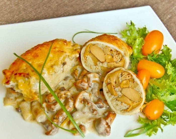 - Фаршируем остывшей жареной начинкой, закрепляем зубочисткой. Теперь следует запекать блюдо около 20-ти мин при температуре 200 градусов.
