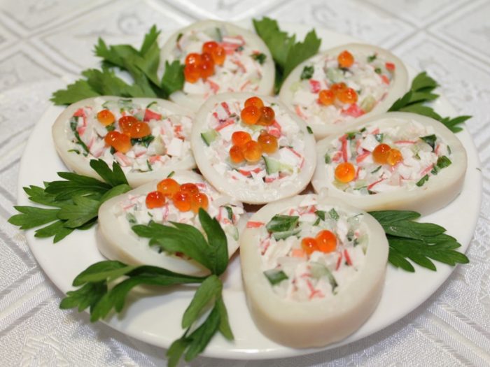 В качестве начинки для кальмаров в рецепте используются крабовые палочки. Такое эффектное блюдо подходит как для праздничного стола, так и для простого ужина.