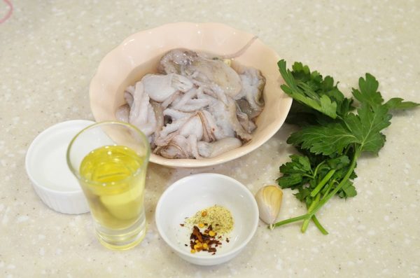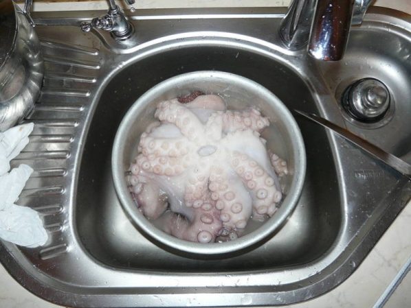 - Осьминога хорошенько помыть, разделать, вынуть все потроха и счистить шкурку.