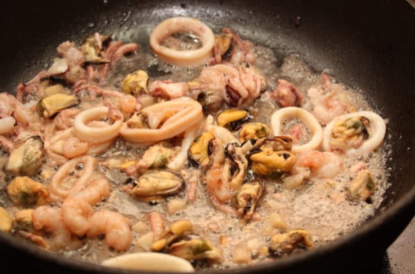 - В разогретое оливковое масло забрасываем мелко нарезанный лук и чеснок. После добавляем дары моря. Три минуты готовятся в собственном соку.