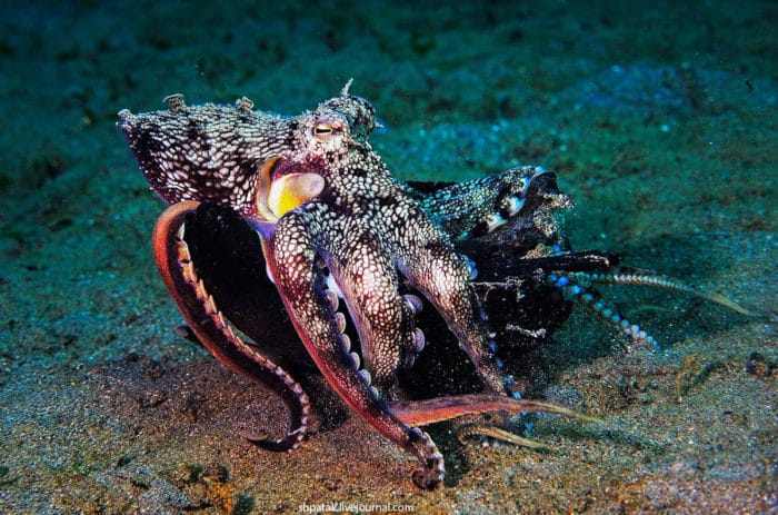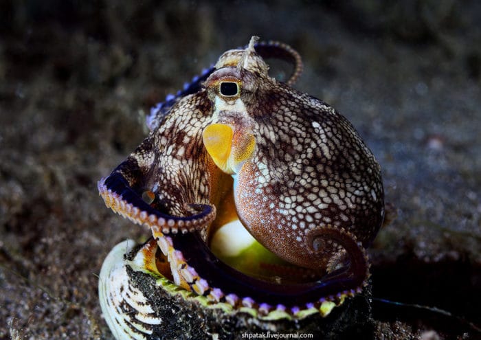 Он умеет менять свой окрас в зависимости от настроения. Это происходит благодаря множеству красящих пигментов в организме. Под влиянием импульсов, исходящих от нервной системы, в обычном состоянии осьминог имеет коричневатый оттенок, как на фото, в злом – красный, а когда он испуган – белый.