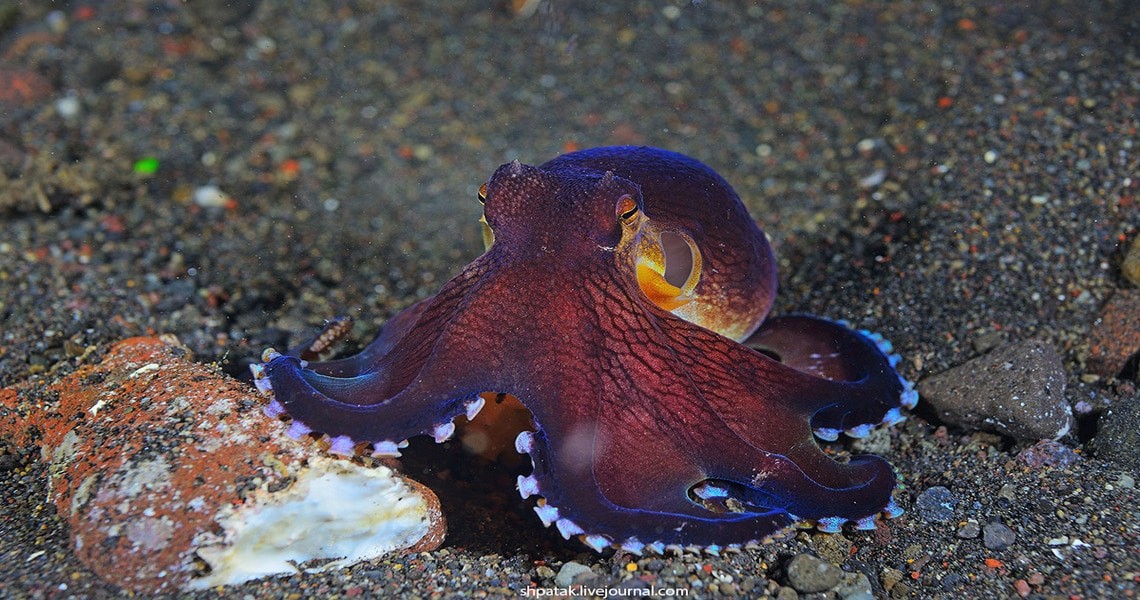 Он принадлежит роду amphioctopus marginatus и водится в западной части Тихого океана, предпочитая более теплые течения. Питается небольшими моллюсками, крабами и креветками.