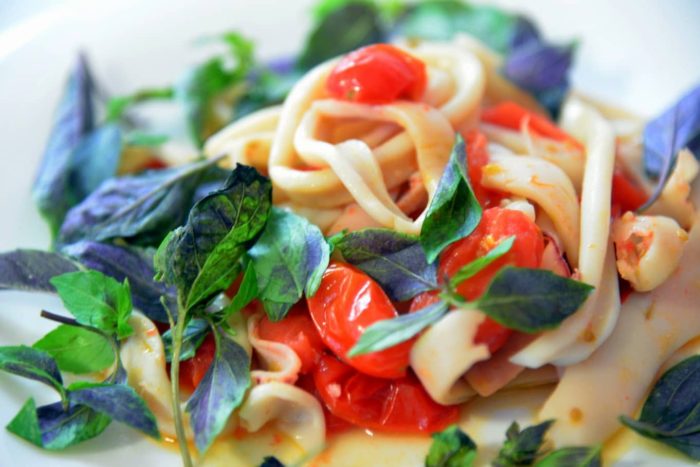 - Нагреть сковороду, вылить оливковое масло, переложить кальмар, прожарить в течение двух минут каждую сторону морепродукта.