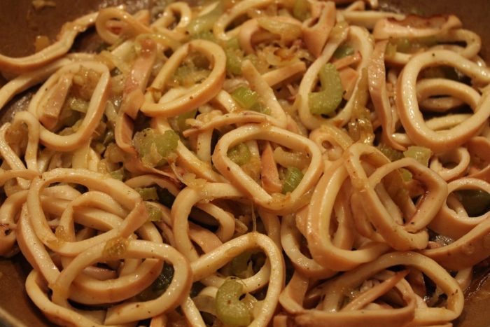 - К чесноку добавить разрезанные кальмары с осьминогами, пожарить несколько минут.